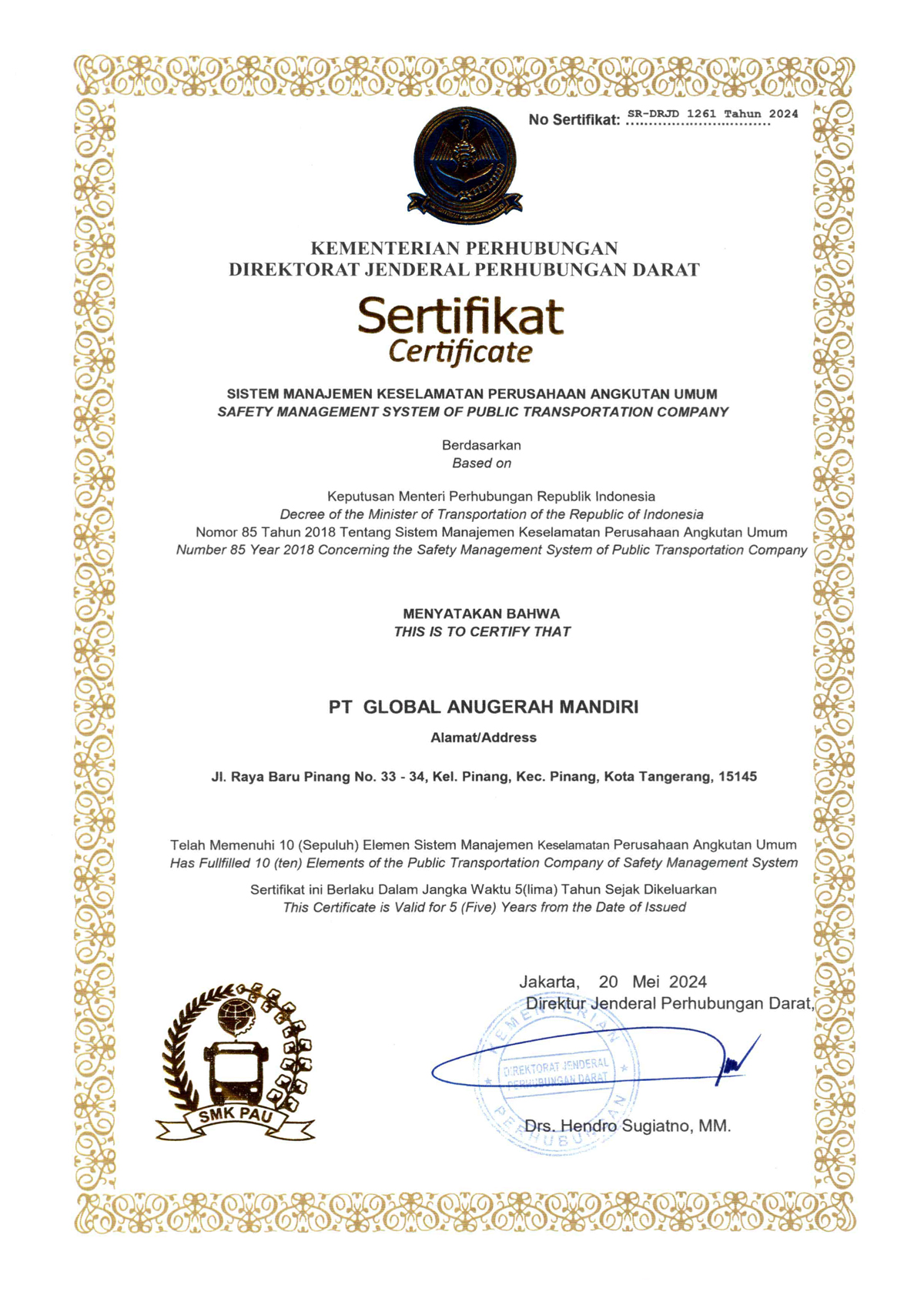 PT Global Anugerah Mandiri, yang beroperasi di bawah nama layanan William Trans, dengan bangga mengumumkan pencapaian penting dalam upaya kami untuk memberikan layanan transportasi terbaik dan teraman. Kami telah resmi mendapatkan Sertifikat Manajemen Keselamatan Perusahaan Angkutan Umum (SMK PAU) dari Kementerian Perhubungan Republik Indonesia.